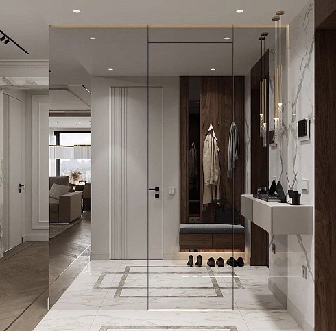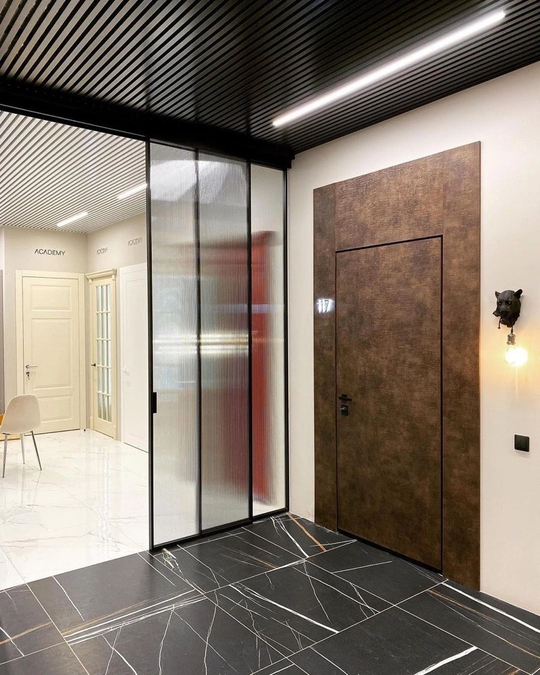 В производстве дверных полотен распространены стеклянные, пластиковые и металлические материалы. Использование зеркал и отражающих поверхностей рассеивает свет, что позволяет визуально увеличивать площадь квартиры.