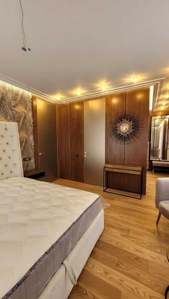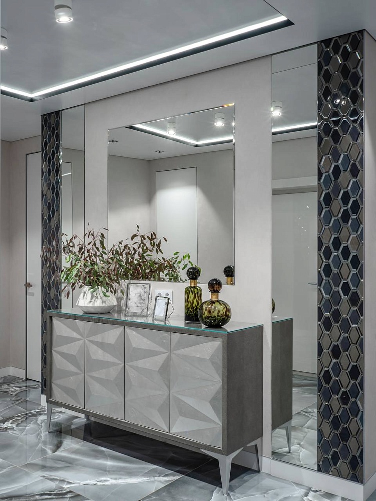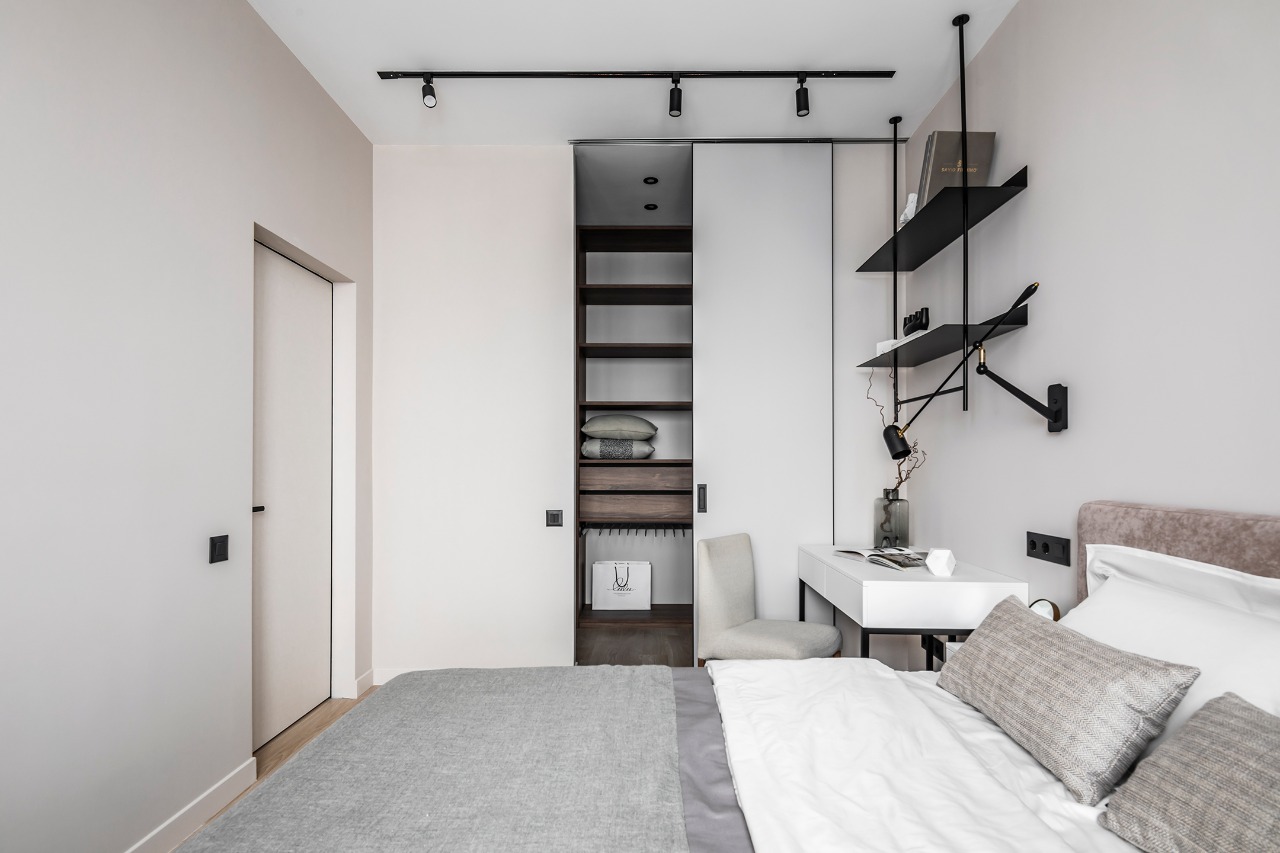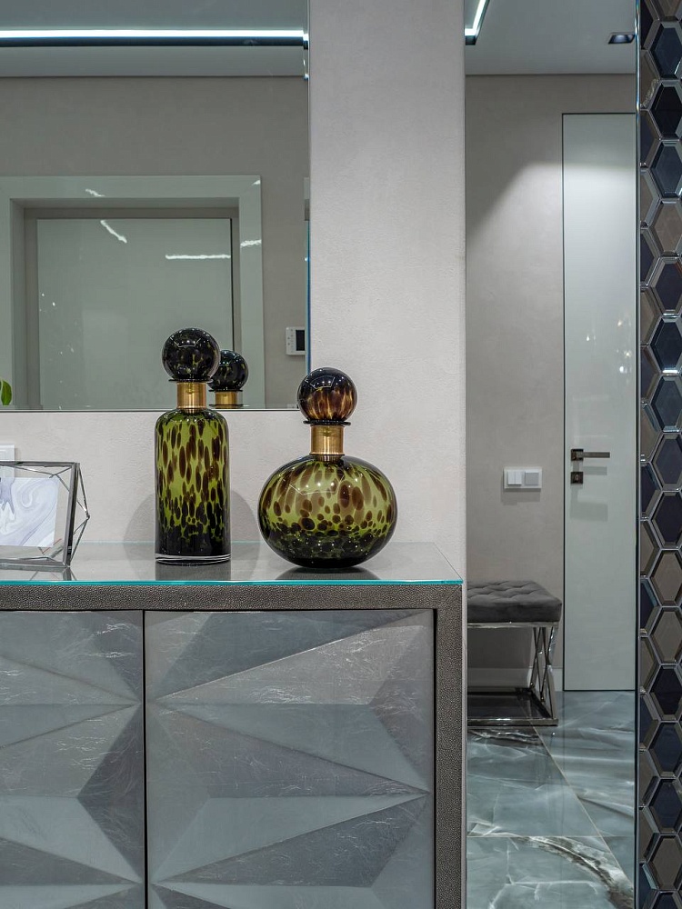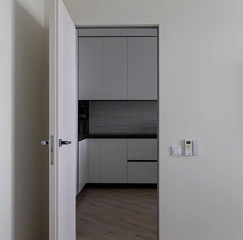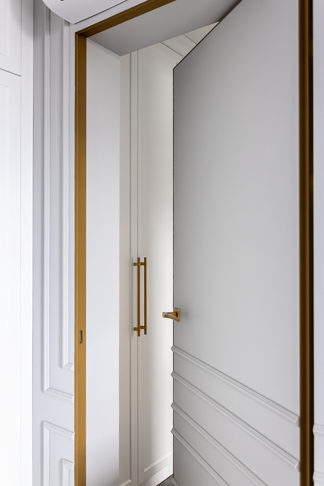 Лёгкость и изящество в каждой детали. Скрытые двери со стеклом разгружают интерьер, способствуют
