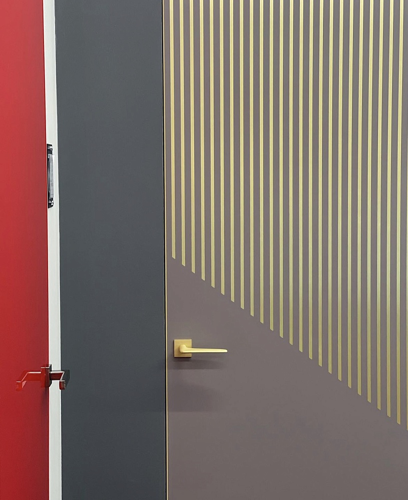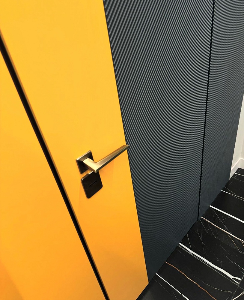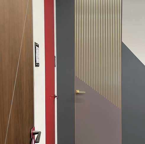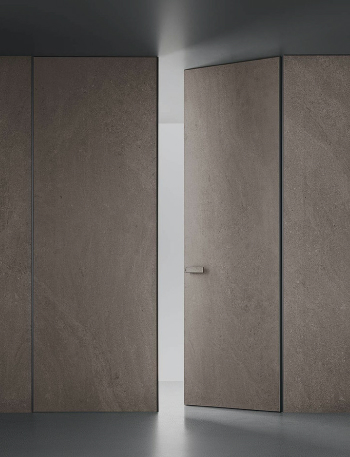 Двери комплектуются скрытыми, регулируемыми в трех плоскостях и с открыванием до 180°(зависит от способа монтажа) петлями и бесшумными магнитными замками с пластиковым язычком итальянского производства. Доступны к заказу раздвижные двери и стеновые панели в цвет дверей.