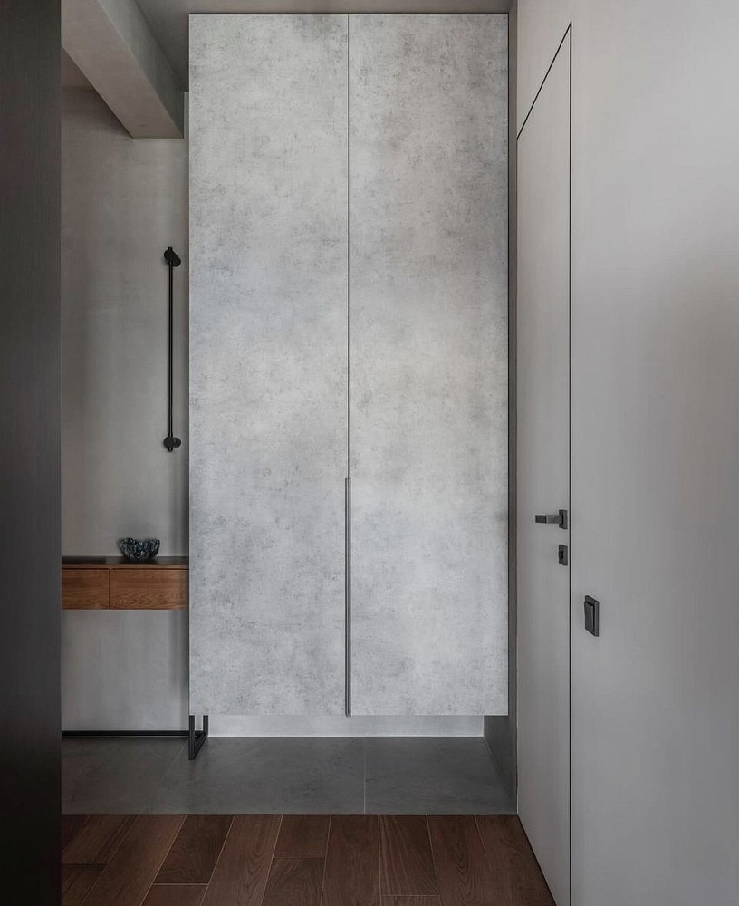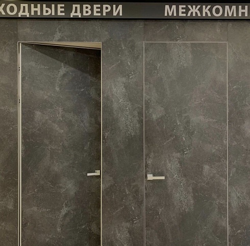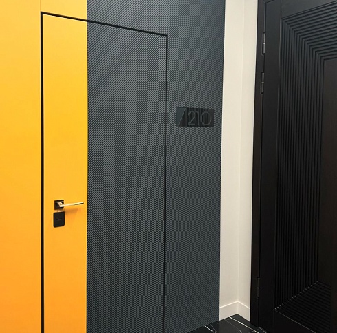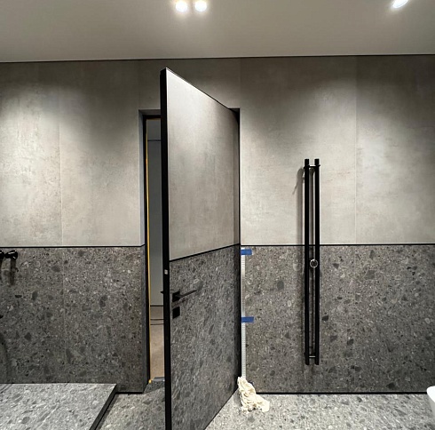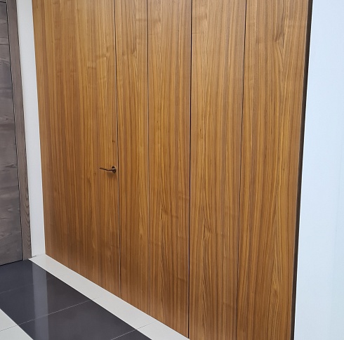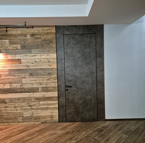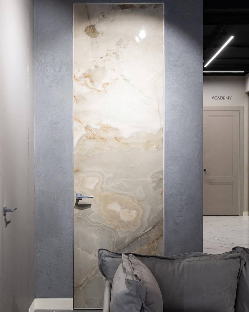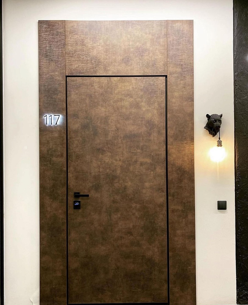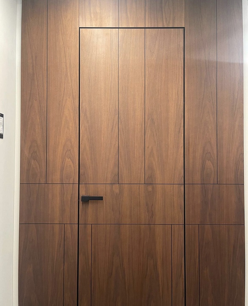 Современно и эстетично. Добавить графичности или сделать акцент именно на скрытой двери помогут современные отделки, например, шпонированные панели или оформление антивандальным материалом с имитацией природного камня. Бонус - возможность изменения облика в соответствии с новыми требованиями интерьера.