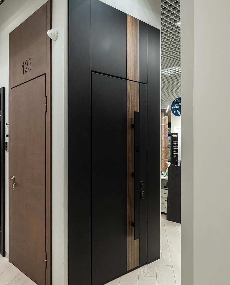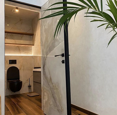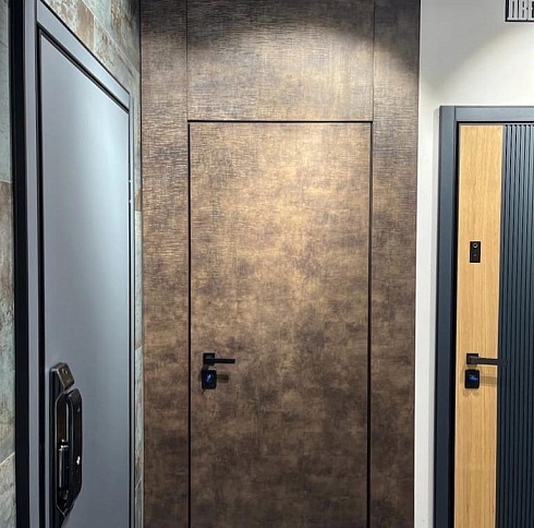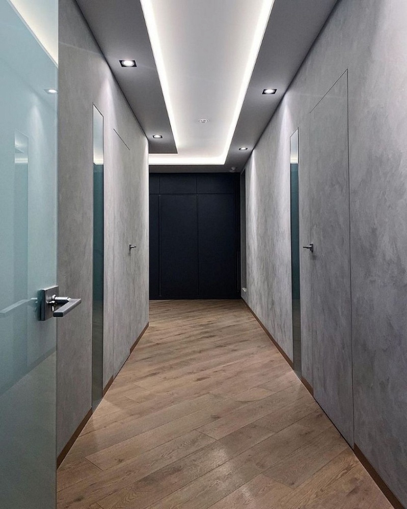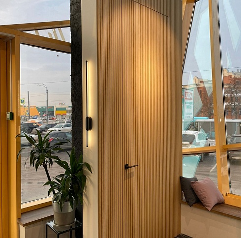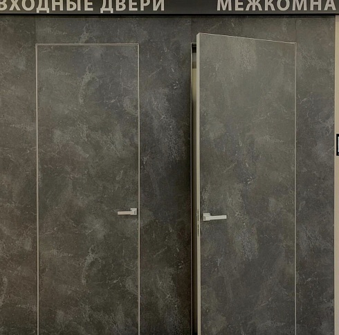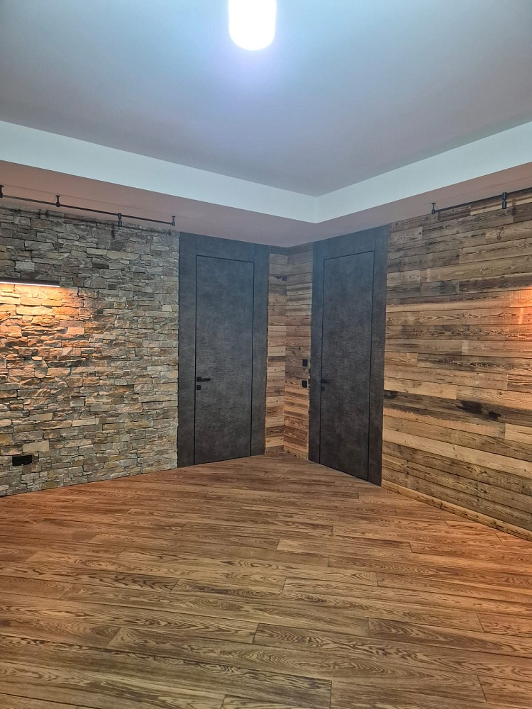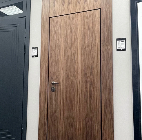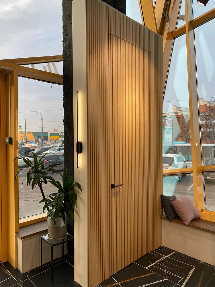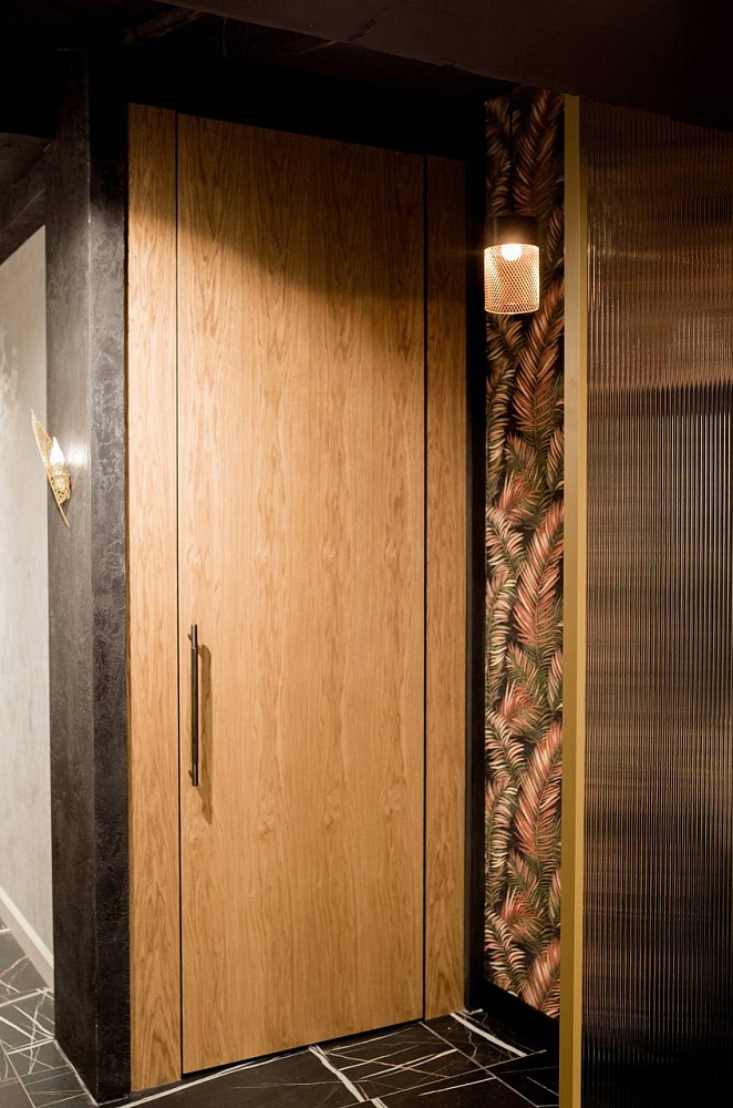 Современно и эстетично. Добавить графичности или сделать акцент именно на скрытой двери помогут современные отделки, например, шпонированные панели или оформление антивандальным материалом с имитацией природного камня. Бонус - возможность изменения облика в соответствии с новыми требованиями интерьера.
