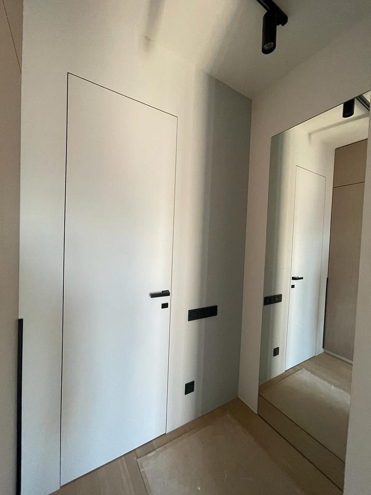 Дверь, которая растворится в дизайнерском пространстве. Универсальное решение - гладкое полотно со срытым коробом, обработанное белым грунтом.